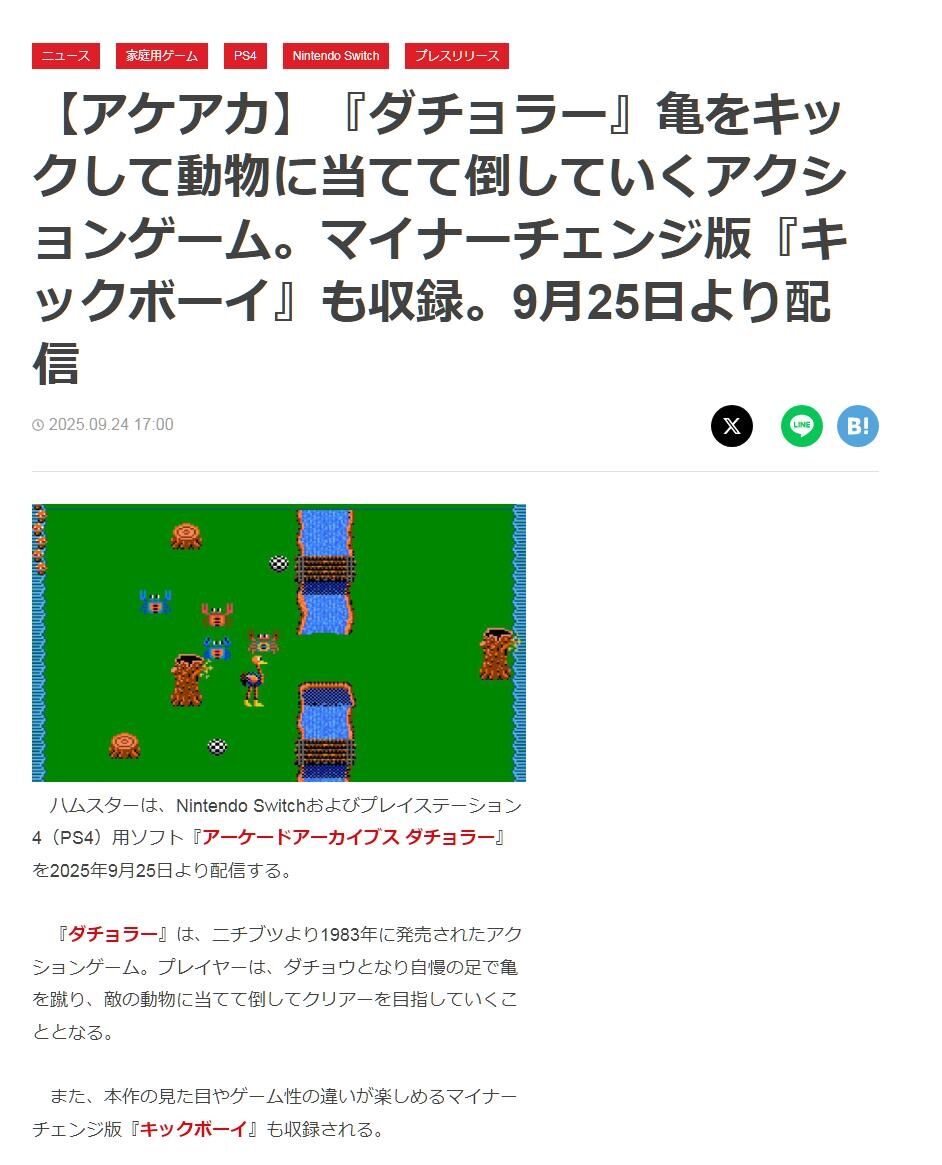【アケアカ】『ダチョラー』亀をキックして動物に当てて倒していくアクションゲーム。マイナーチェンジ版『キックボーイ』も収録。9月25日より配信