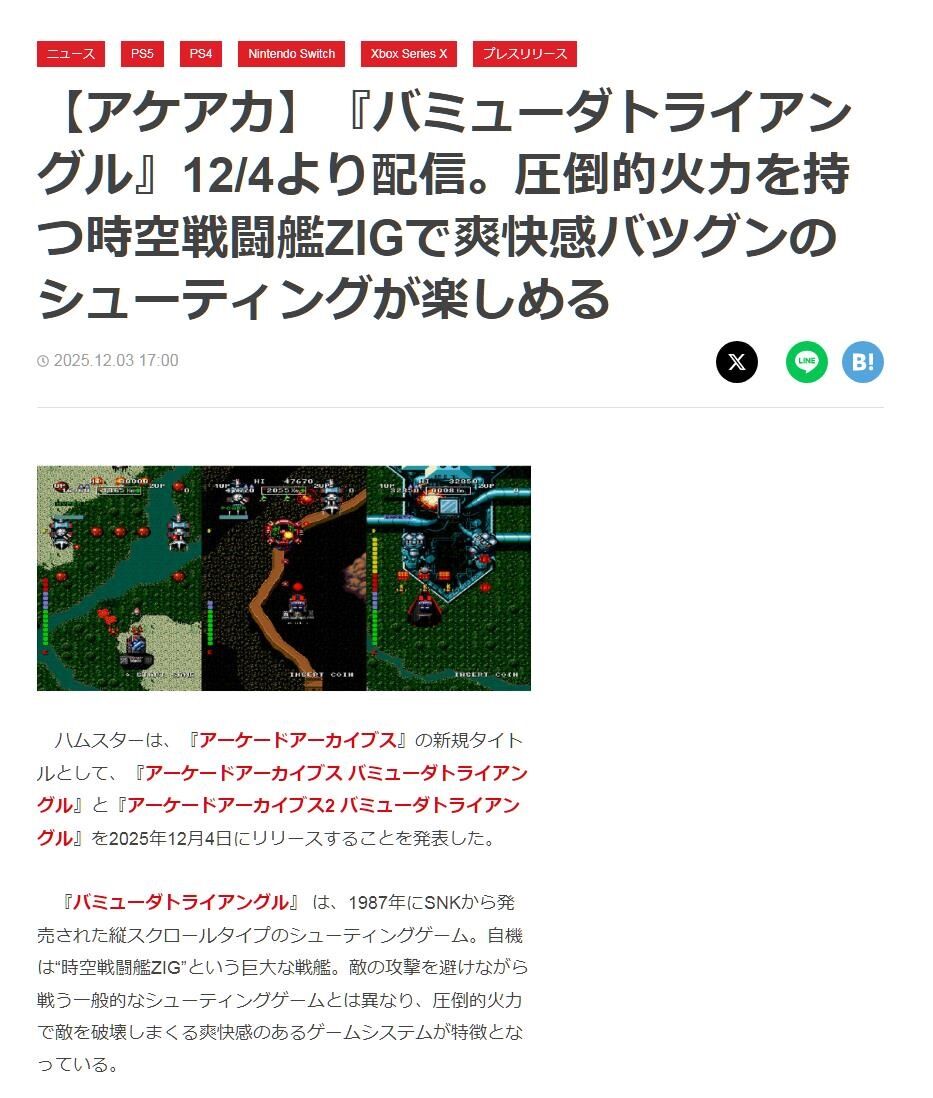 【アケアカ】『バミューダトライアングル』12/4より配信。圧倒的火力を持つ時空戦闘艦ZIGで爽快感バツグンのシューティングが楽しめる