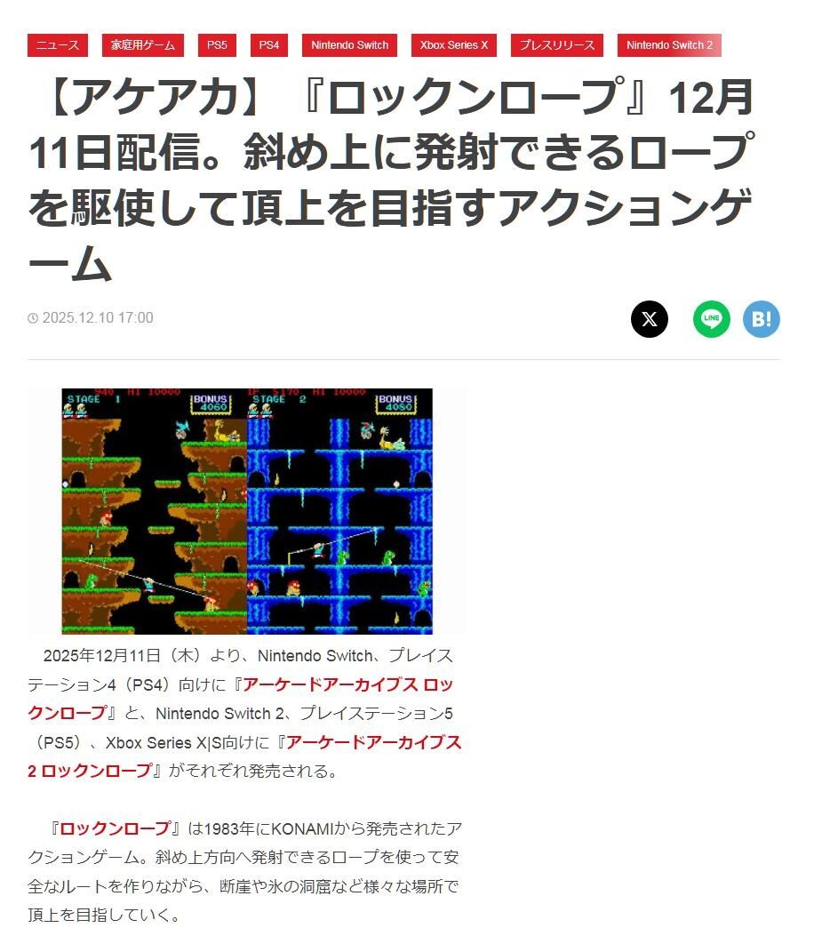 【アケアカ】『ロックンロープ』12月11日配信。斜め上に発射できるロープを駆使して頂上を目指すアクションゲーム