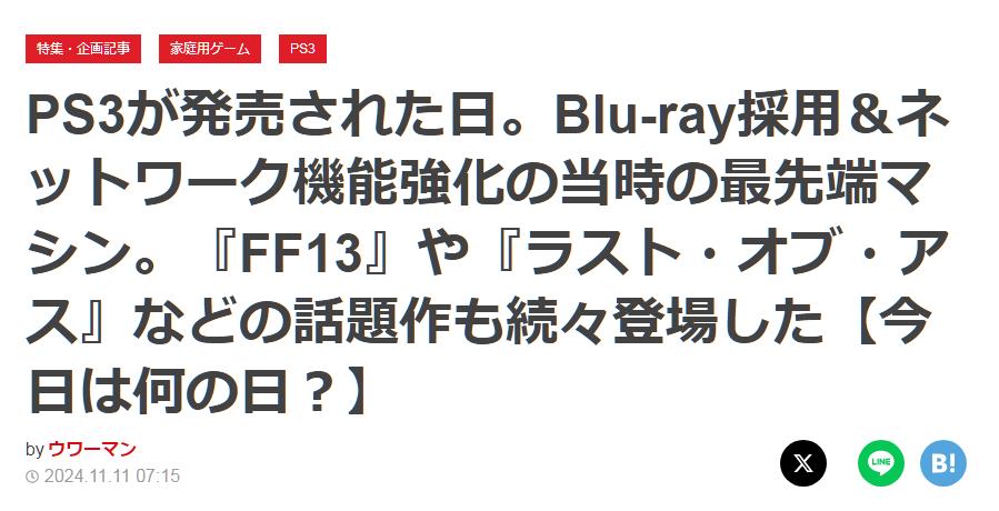 いまから18年前の2006年(平成18年)11月11日は、プレイステーション3(PS3)が発売された日。
